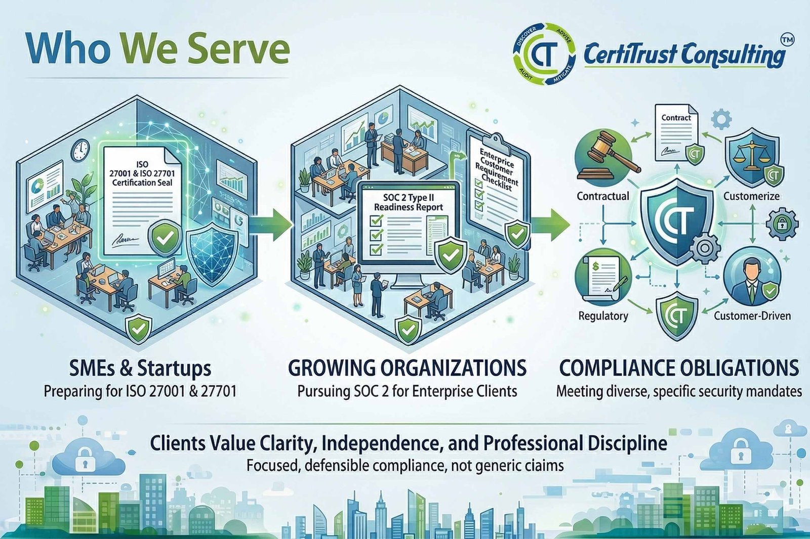 At CertiTrust Consulting, our mission is to empower organizations with expert information security consulting, implementation guidance, and independent audits. We help clients achieve ISO 27001, ISO 27701, SOC 2 compliance and stronger cybersecurity resilience, while upholding the highest standards of ethics, transparency, and impartiality. Through tailored, practical, and future-ready solutions, we enable businesses to mitigate risks, safeguard data, and build lasting trust in a rapidly evolving digital world.